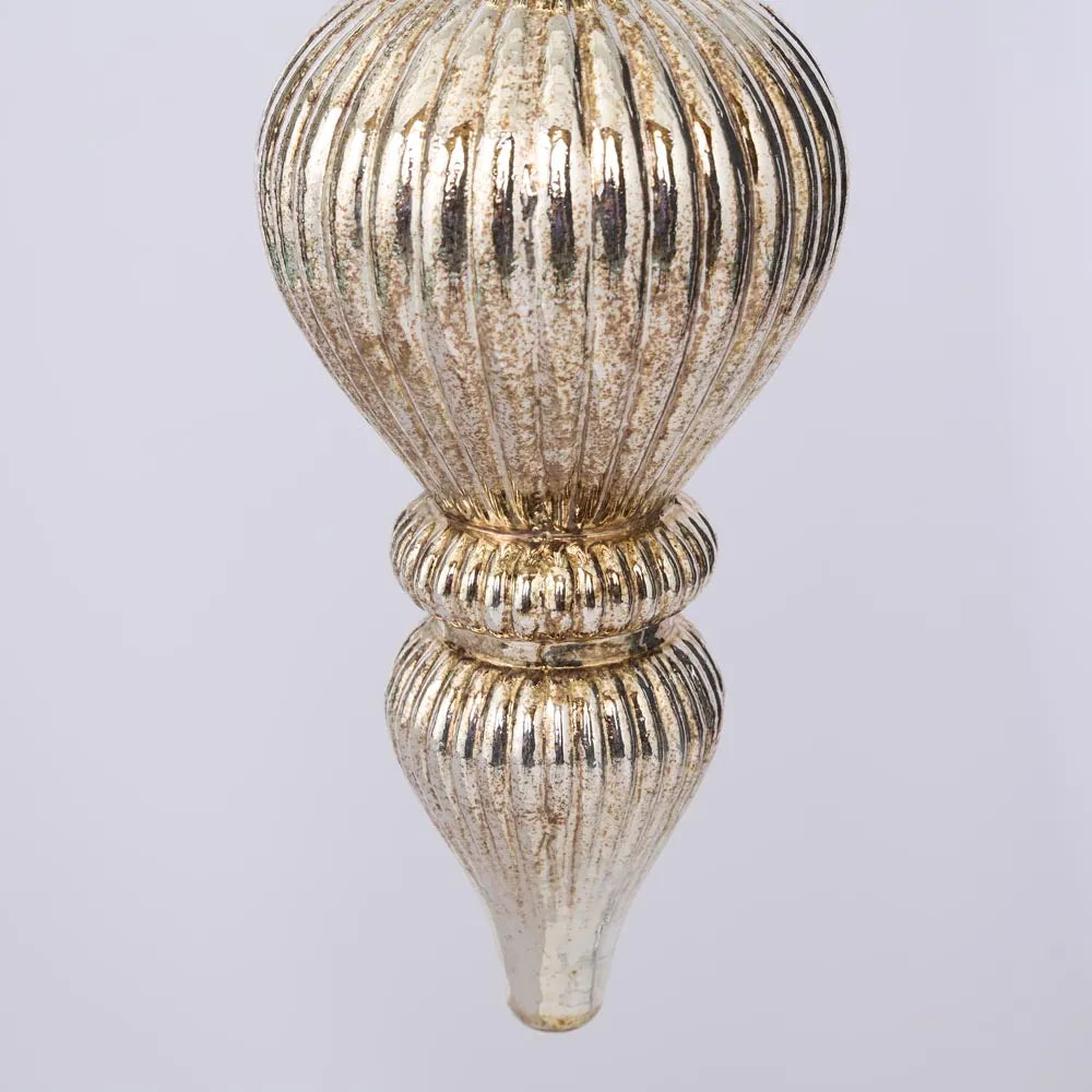 Bring timeless sophistication to your Christmas décor with our Antiqued Glass Hanging Finial in Gold. Crafted with exquisite attention to detail, this ornament features a beautifully ribbed silhouette and a rich, hand-finished antiqued gold patina that catches the light with a soft, vintage shimmer. Hanging loop included for easy display.