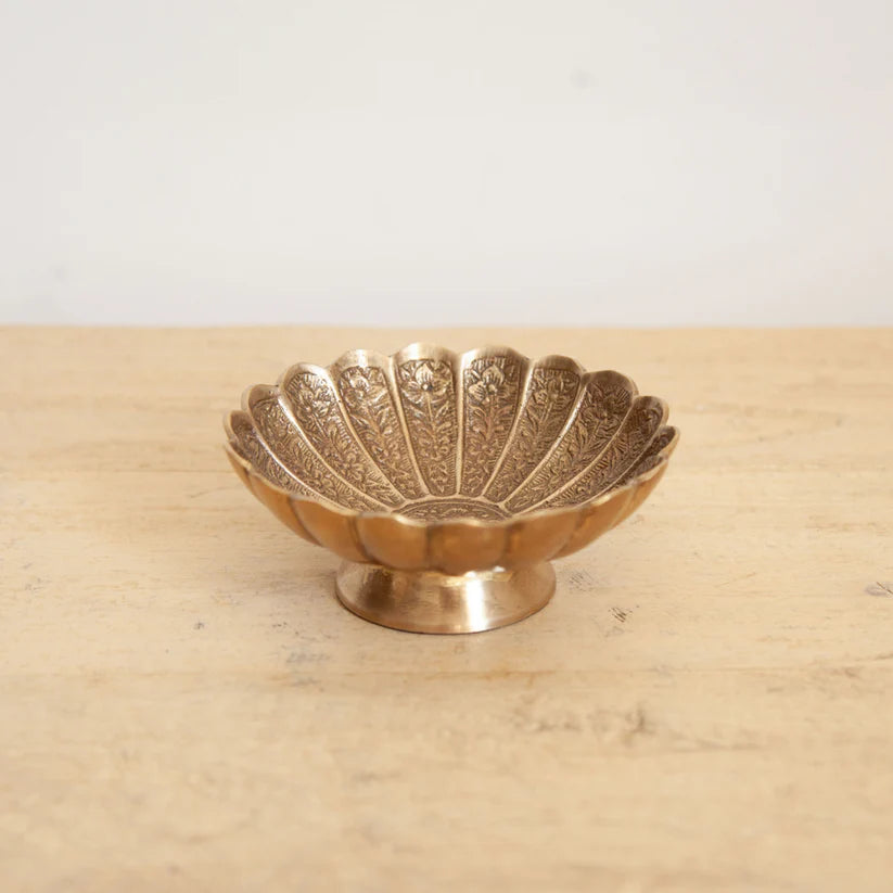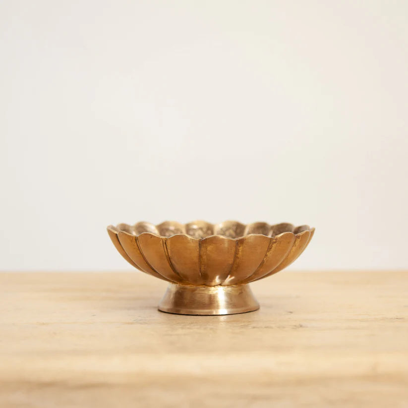 A delicate hand-cast brass trinket dish with a softly curved floral shape and intricate detailing. Perfect for holding jewellery, keys, or other tiny treasures, it brings a touch of elegance and nostalgia to any space.