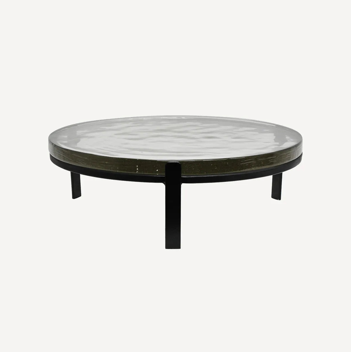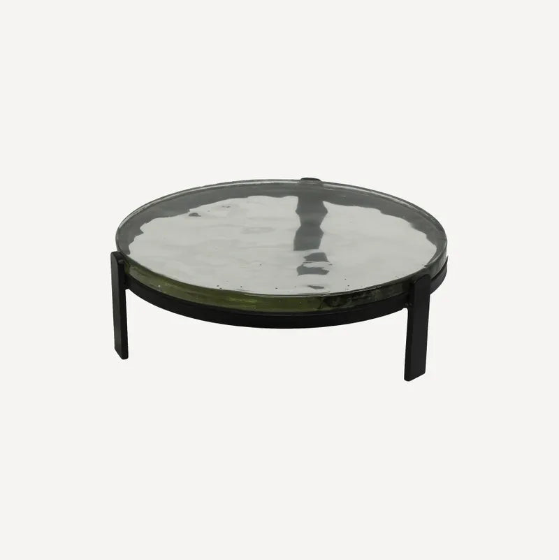Dappled glass candle plate with black metal base. Create soft light that bounces off the glass with multiple sized candles.
