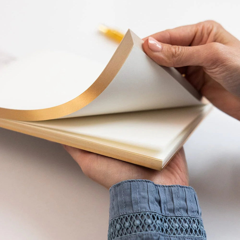 Illustrated by Christine De Carvalho, Featuring 100 heavyweight tear off blank pages. Bound with a gummed edge, and full heavyweight wrap around cover. Removable Gold Foil printed Bellyband and gold foil and gilded edges.