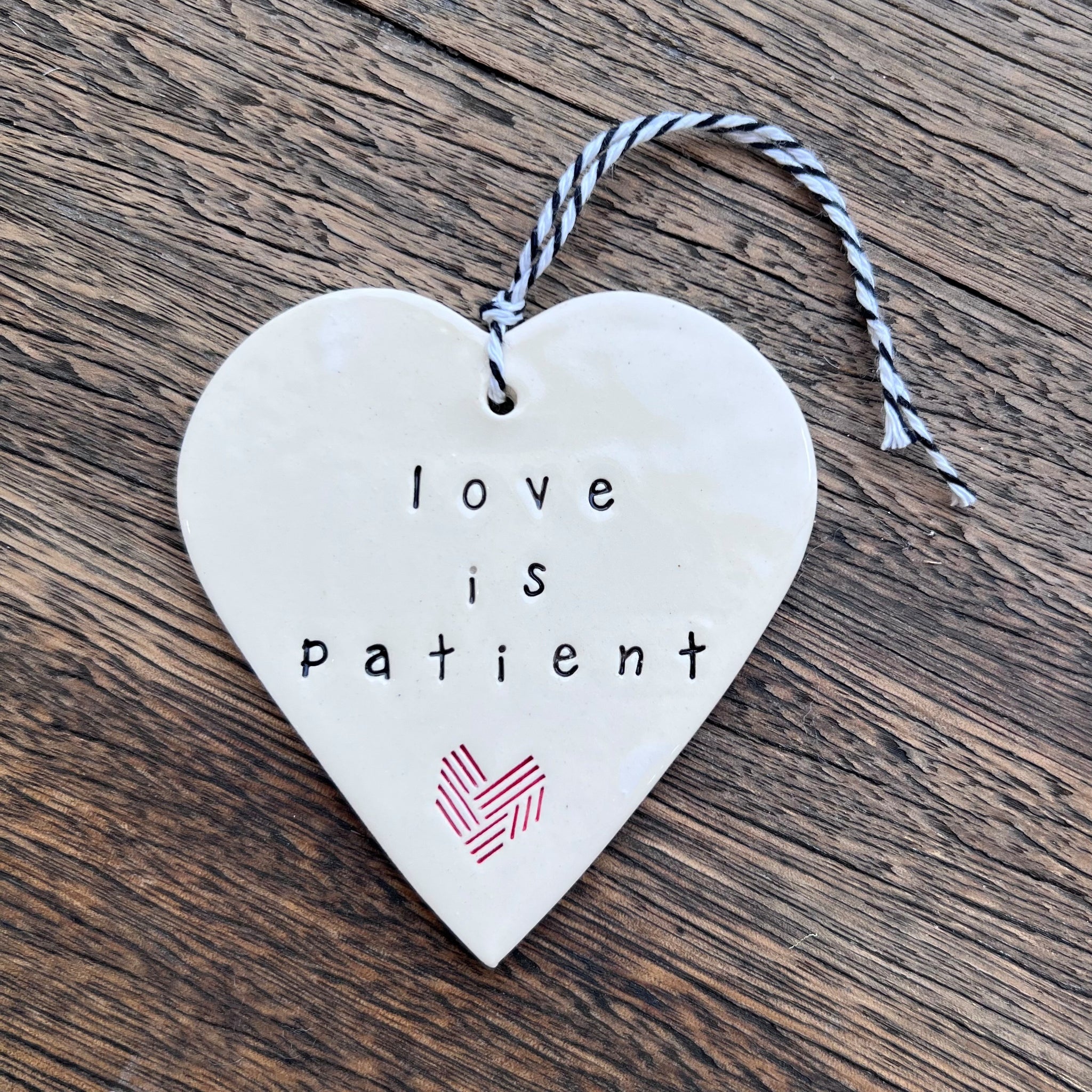 The Love Is Patient ceramic tag is exclusive to Well Versed Homes, designed by Jo, and handmade in Queensland. Featuring our WVH heart icon and full glazed. You can add a message to the back of the heart using a sharpie pen if you wish.