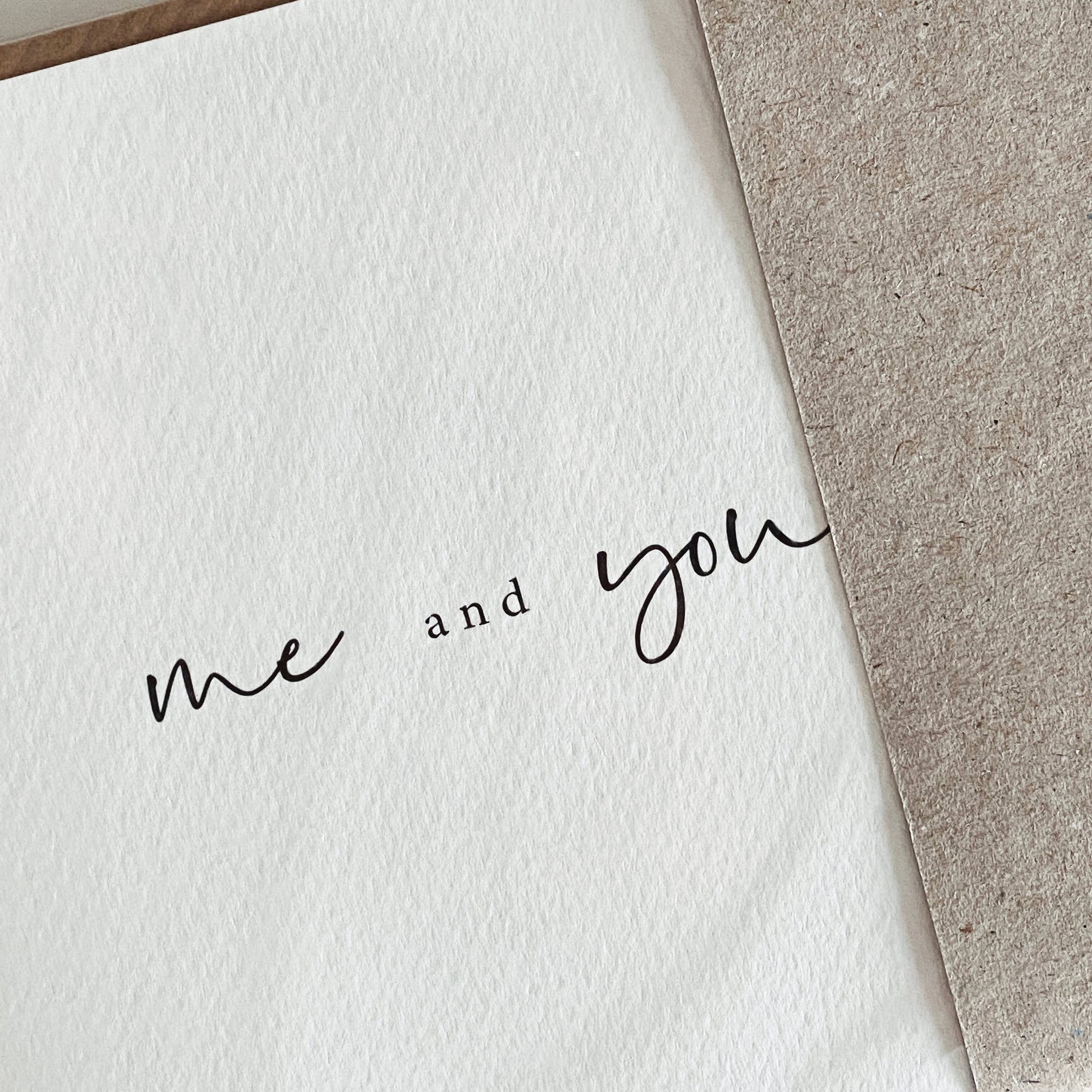 Greeting card with 'me and you' text, brown envelope, and pencil on a white background