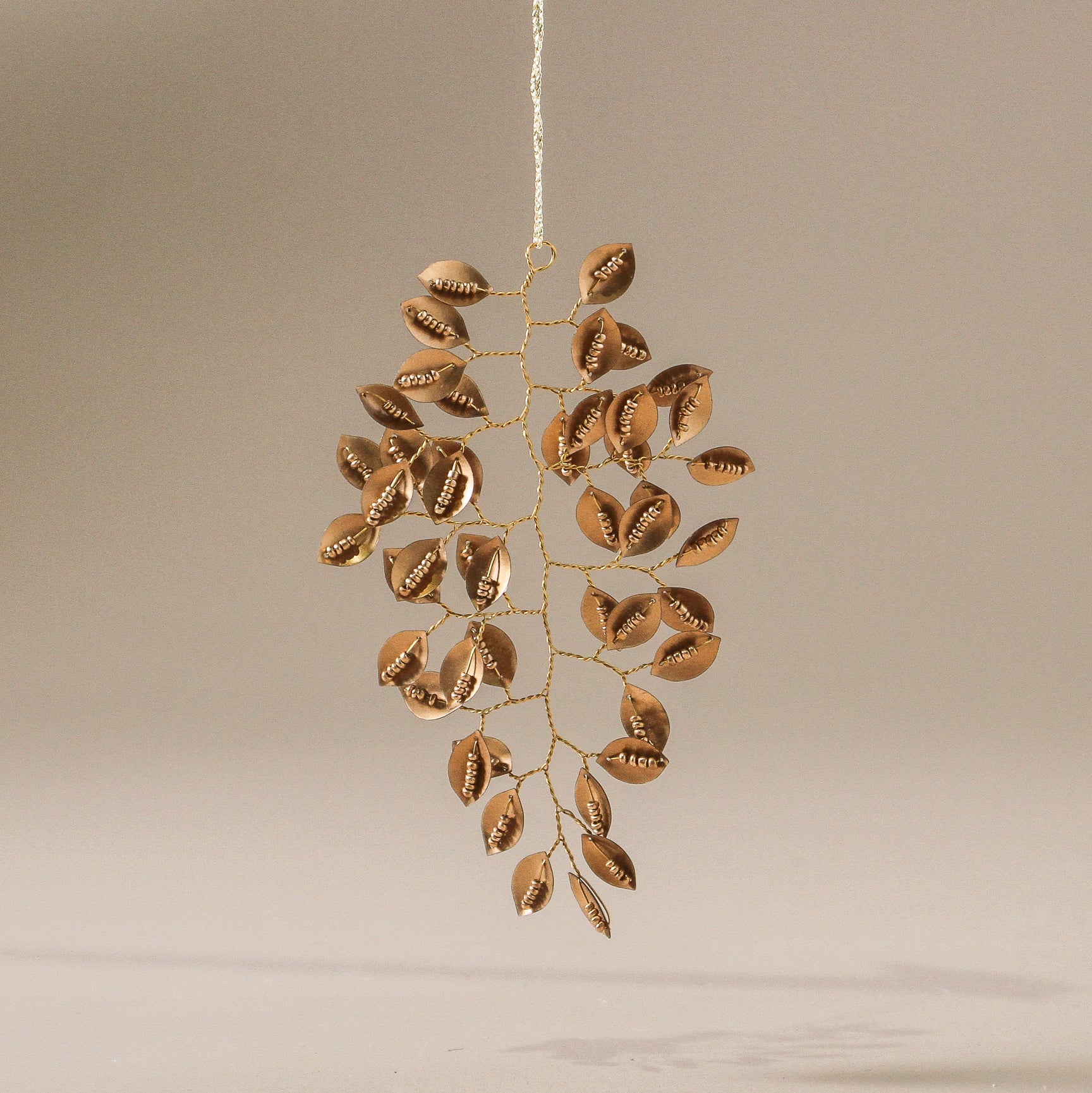 The Flora Sequinned Decoration evokes a golden branch gathered at dawn — delicate, organic, and glistening with dewdrops of beads. Each tiny leaf is hand-formed from golden metal, their surfaces dappled with beads that catch the light with every movement. It’s a miniature foliage piece that brings texture, light, and a whisper of the natural world to your tree.