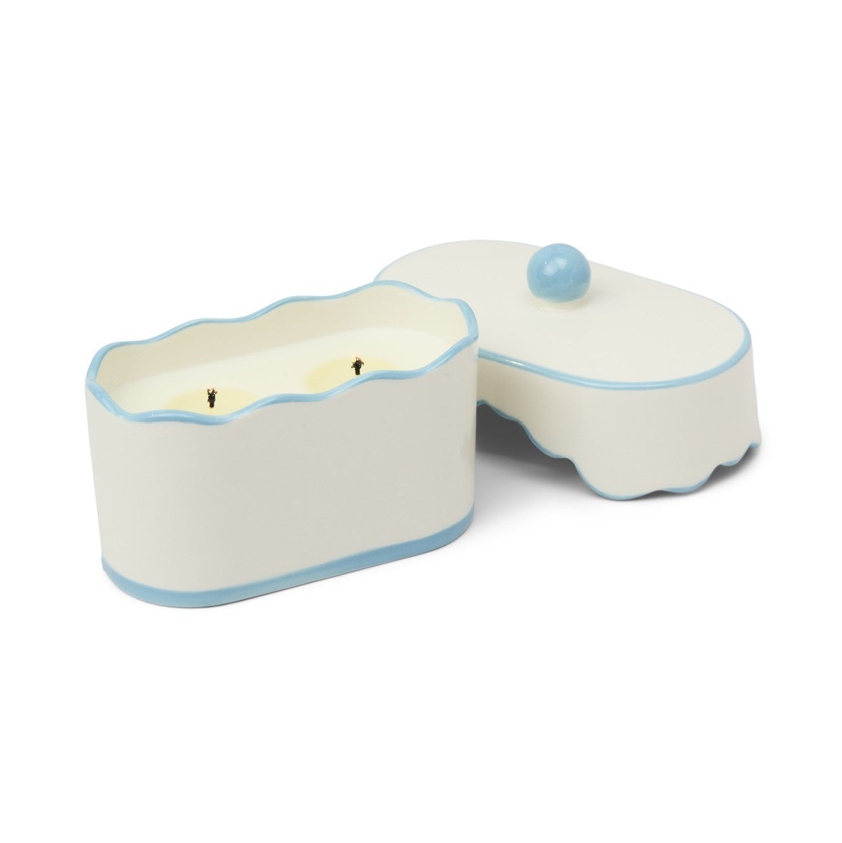 This stunning Lavender & Thyme candle is poured in a porcelain vessel with soft blue and white hand-painted detailing.
